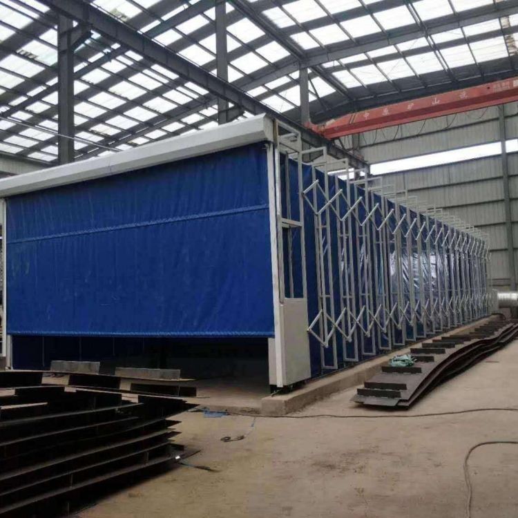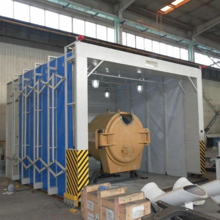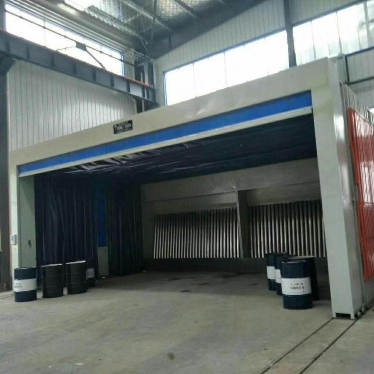 配置按工件大小、形状、重量及生产纲领可有多种方式:有开式、闭式之分;有连续式、间歇式之分;有工件自转或固定之分;有单侧喷涂及双侧喷涂之分。近年又发展出油帘喷漆室、下喷漆房等。结构上应包括:送风过滤系统、工件吊挂(输送、自转)装置、水帘系统、水洗系统、排风系统、水槽、照明装置及室体。