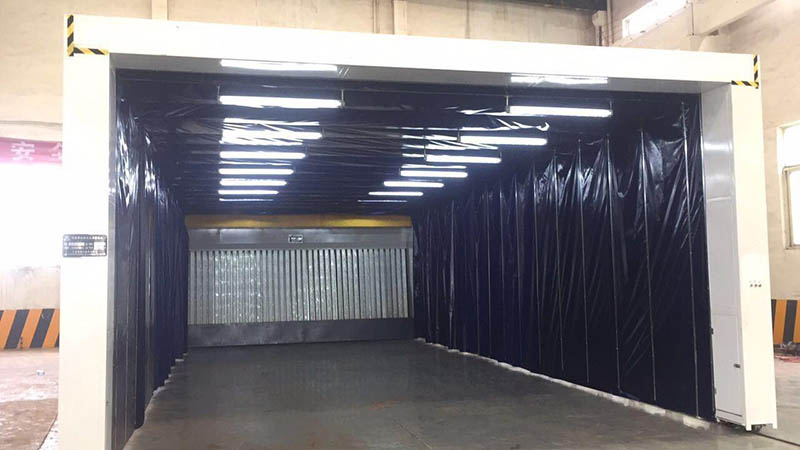 在伸移动折叠喷漆房的起点与终点均设有一个限位开关挡块,当前室打开时,一个限位开关接触到挡块后减速机自动停止,若一个限位开关失灵那么二个限位开关继续起作用,因此起到双重保护作用;当前室合拢时也同样采用双重限位开关,确保果酱视频色版前室性。